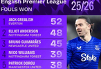 根據(jù)Squawka的統(tǒng)計(jì),格拉利什是本賽季被犯規(guī)次數(shù)最多的球員。