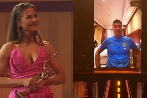 體育資訊1月11日訊 巴薩球星萊萬榮獲波蘭媒體《體育評論》特別獎(jiǎng)項(xiàng)“世紀(jì)最佳運(yùn)動(dòng)員”,他的妻子安娜代替正在沙特參加西超杯的萊萬出席頒獎(jiǎng)典禮。在現(xiàn)場連線中,萊萬發(fā)表了自己的獲獎(jiǎng)感言。