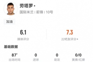 體育資訊1月12日訊 國米在本輪意甲對(duì)陣那不勒斯,勞塔羅本場數(shù)據(jù)如下: