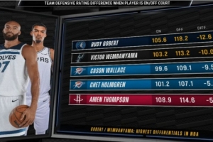防守效率差:球員在場(chǎng)和不在場(chǎng)時(shí),球隊(duì)每百回合失分差。