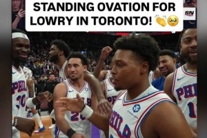 在本場比賽的最后垃圾時間,76人后衛(wèi)洛瑞在猛龍主場球迷的歡呼聲中上場,并得到了致敬。