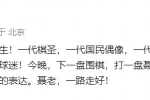 黃健翔寫道:沉痛哀悼聶衛(wèi)平先生!一代棋圣,一代國民偶像,一代大學(xué)生的圍棋啟蒙導(dǎo)師,一位真心狂熱的中國球迷!今晚,下一盤圍棋,打一盤聶老當(dāng)年中日圍棋擂臺賽的棋譜,是我個人最好的表達(dá)。聶老,一路走好! ???