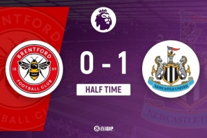 傷停補(bǔ)時(shí)5分鐘。上半場比賽結(jié)束,布倫特福德0-1紐卡斯?fàn)柭?lián)。