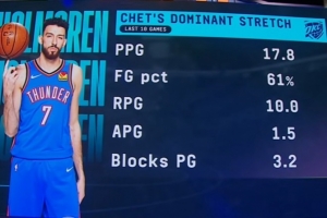 據(jù)統(tǒng)計,在最近10場比賽中,霍姆格倫場均可以得到17.8分10籃板1.5助攻3.2蓋帽,投籃命中率高達61%!