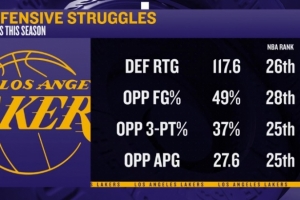 體育資訊1月17日訊 今日,ESPN總結(jié)了湖人本賽季至今糟糕的防守數(shù)據(jù):