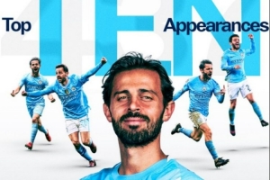 據統(tǒng)計,這是B席第437次代表曼城出場,躋身隊史出場次數前十,具體榜單如下: