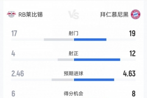 體育資訊1月18日訊 本輪德甲,拜仁5-1逆轉(zhuǎn)客勝雙殺萊比錫。雙方全場(chǎng)重點(diǎn)數(shù)據(jù)對(duì)比如下↓(主隊(duì)萊比錫在前)