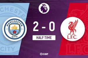 上半場補(bǔ)時(shí)7分鐘,曼城2-0利物浦。