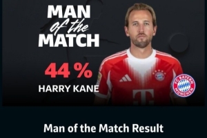 凱恩在本場(chǎng)比賽打進(jìn)1球,獲得了44%的得票率。值得一提的是,替補(bǔ)獨(dú)造4球的奧利塞并未進(jìn)入候選名單。