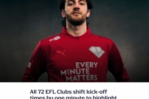 在2月5日至9日期間,英格蘭足球聯(lián)賽(EFL)的72家俱樂部將把36場比賽的開球時間推遲一分鐘,以提醒人們在進行心肺復蘇術(CPR)時每一分鐘都至關重要。