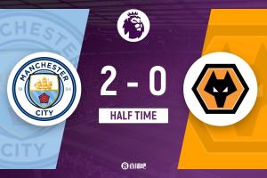 上半場傷停補時4分鐘,半場結(jié)束,曼城暫2-0狼隊。