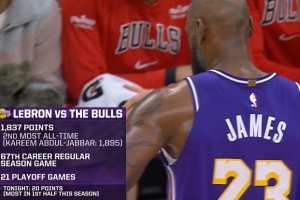 詹姆斯生涯對陣公牛1837分僅次于賈巴爾1895分