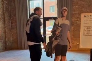 視頻當(dāng)中,東契奇將里夫斯的真人等高紙板一把推倒,隨后分別進(jìn)行高爾夫推桿嘗試但均未成功,兩人也不忘互損一番。