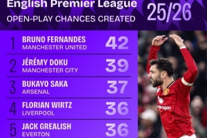 體育資訊1月27日訊 Squawka統(tǒng)計(jì)本賽季至今英超球員運(yùn)動(dòng)戰(zhàn)創(chuàng)造機(jī)會(huì)次數(shù),B費(fèi)42次居首,多庫(kù)39次第二,薩卡37次第三。