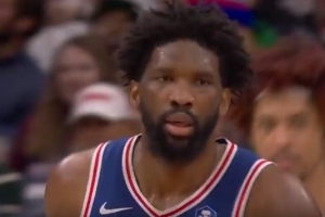 GIF-恩比德反擊上籃被羅林斯干擾,裁判吹犯規(guī),雄鹿挑戰(zhàn)成功,取消犯規(guī)