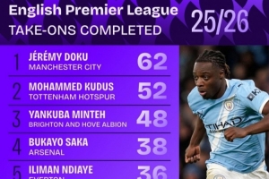 體育資訊1月28日訊 Squawka統(tǒng)計(jì)了本賽季球員在英超的成功過人次數(shù),并列出榜單,多庫62次成功過人居首。