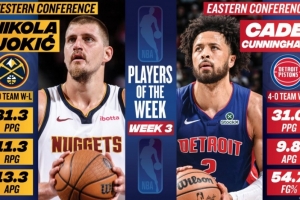體育資訊11月11日訊 今日NBA官方宣布,活塞球星康寧漢姆和掘金球星約基奇當選本賽季第3周東、西部最佳球員。