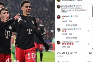 本場比賽穆西亞拉破門,賽后他也在個人社媒曬出本場照片,配文寫道:“回到歐冠取得很棒的勝利,很高興能夠收獲回歸以來的首粒進球。”