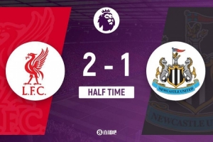 下半場傷停補(bǔ)時(shí)5分鐘,半場結(jié)束,利物浦暫2-1紐卡斯?fàn)枴?/p>