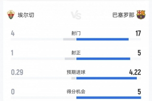 體育資訊2月1日訊 本輪西甲,巴薩半場2-1領先埃爾切。雙方半場重點數(shù)據(jù)對比如下↓(主隊埃爾切在前)