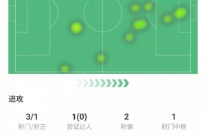 射門(mén)3次,射正1次,過(guò)人1次沒(méi)成功,射偏2次,中柱1次,丟失球權(quán)2次,預(yù)期進(jìn)球0.6球