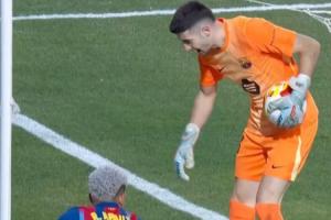 上半場(chǎng),阿勞霍和霍安·加西亞合力防下了對(duì)手的一次進(jìn)攻,霍安·加西亞將球沒(méi)收后,似乎沒(méi)意識(shí)到此刻并不是死球狀態(tài),他拿著球走出底線,拍了拍阿勞霍的頭來(lái)慶祝。這送給對(duì)手一個(gè)角球。