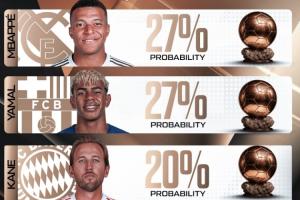 體育資訊02月04日訊 相關(guān)機構(gòu)近期更新了2026年金球獎的獲獎概率預(yù)測,目前姆巴佩與亞馬爾并列領(lǐng)跑,兩人獲獎概率均為27%,凱恩和哈蘭德則緊隨其后。