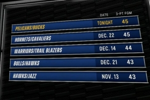 本場比賽雄鹿三分47中21,鵜鶘46中24,雙方合計命中45記三分,平本賽季單場最多。