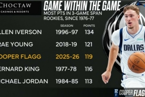 過去三場(chǎng)比賽弗拉格合砍119分,是自76-77賽季新秀連續(xù)三場(chǎng)得分之和的第三高,僅次于艾弗森和特雷·楊。