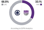 今日ESPN曬出本場(chǎng)獲勝概率預(yù)測(cè),快船高達(dá)66.9%,國(guó)王僅有33.1%。
