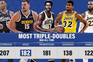 在本場比賽中,約基奇拿到生涯第182次三雙,超越奧斯卡·羅伯特森,上升至NBA歷史第二。