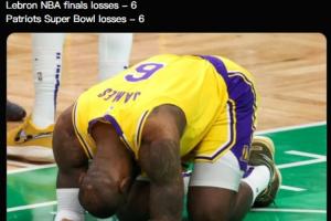 美媒發(fā)推寫道:“詹姆斯總決賽失利次數(shù)6次,愛國者超級碗失利次數(shù)6次?!?/p>