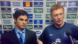 畫面中是穿球衣的莫耶斯和23歲穿西裝的阿爾特塔,在2005年埃弗頓主場2-0擊敗紐卡斯?fàn)枺i定英超前四后接受采訪。