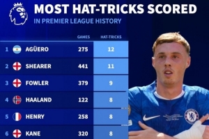 體育資訊2月10日訊 切爾西在本輪英超3-1擊敗狼隊,帕爾默上演帽子戲法,《轉(zhuǎn)會市場》統(tǒng)計顯示帕爾默已經(jīng)在英超4次戴帽,位列聯(lián)賽歷史第16位。