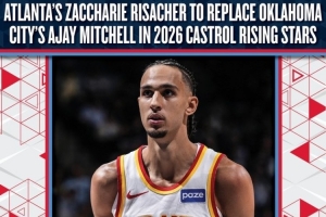 體育資訊2月11日訊 NBA官方宣布,24年狀元秀老鷹前鋒里薩謝將頂替雷霆后衛(wèi)阿杰伊·米切爾,加入特麥迪執(zhí)教的Team T-Mac,出戰(zhàn)2026年全明星新秀挑戰(zhàn)賽。