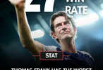 據(jù)統(tǒng)計(jì),托馬斯-弗蘭克創(chuàng)下了英超歷史Big6俱樂(lè)部主教練最低勝率紀(jì)錄: