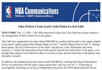 NBA今日宣布,對爵士和步行者兩支球隊近期比賽中的陣容管理行為處以罰款。