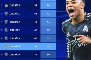 體育資訊2月14日訊 姆巴佩本賽季各項賽事31場比賽已經(jīng)打進(jìn)38球,距離個人單賽季俱樂部進(jìn)球紀(jì)錄還差6球,以下為具體情況: