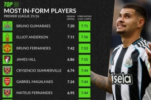 體育資訊2月14日訊 whoscored統(tǒng)計了英超球員近期評分,吉馬良斯、安德森和B費分列前三。