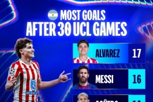 體育資訊11月12日訊 歐冠官方統(tǒng)計(jì)了阿根廷球員前30場(chǎng)歐冠比賽的進(jìn)球數(shù)量,并列出榜單,阿爾瓦雷斯17球居首,梅西16球次席。