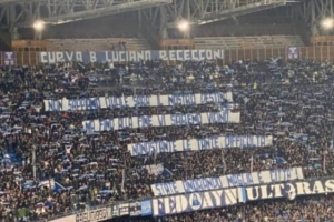 體育資訊2月16日訊 在那不勒斯對(duì)陣羅馬的比賽前,那不勒斯球迷拉橫幅支持球隊(duì)。