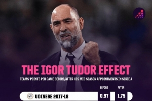 圖多爾意甲賽季中途上任之前、之后球隊場均積分: