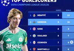 姆巴佩8場比賽打進13球居首;戈登憑借本輪的大四喜躍居射手榜第二;凱恩打入8球排名第三。
