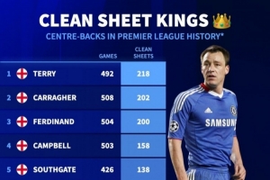 體育資訊2月20日訊 德國轉(zhuǎn)會市場統(tǒng)計了英超歷史中衛(wèi)零封的場次,并列出榜單,特里218場居首,卡拉格、費迪南德二三位。