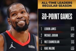 這是杜蘭特生涯第430場(chǎng)得分30+,升至NBA歷史第6,還差1場(chǎng)就能追平科比。