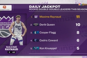 國(guó)王42號(hào)秀雷諾再次拿到兩雙,超過(guò)鵜鶘新秀奎因,兩雙次數(shù)躍升為本屆新秀第一。