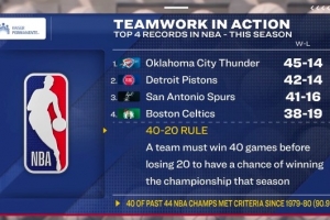 40-20奪冠定律:一支球隊(duì)必須在輸?shù)?0場比賽前贏得40場勝利,才有可能贏得當(dāng)賽季總冠軍。
