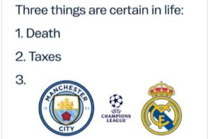 推文配文 “瞧瞧我們。誰能想到呢”,并附上一張玩梗圖,將西方經(jīng)典諺語“人生只有死亡和稅收是確定無疑的”進行改編,新增了第三條“曼城在歐冠對陣皇馬”。