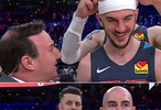 賽后雷霆球員卡魯索在場邊接受隊記Nick Gallo的采訪。哈爾滕施泰因過來整蠱隊記,將卡魯索的頭戴摘下并套在Nick Gallo頭上,發(fā)帶秒變“繃帶”。