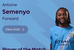 英超第28輪,曼城客場1-0擊敗利茲聯(lián),此役打入唯一進球的曼城前鋒塞門約當選全場最佳球員。